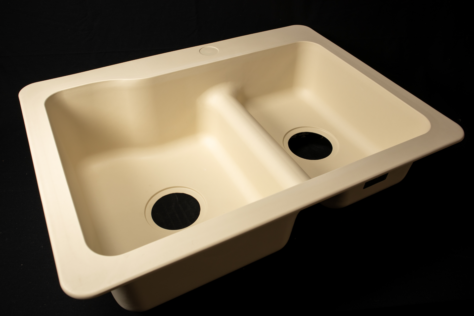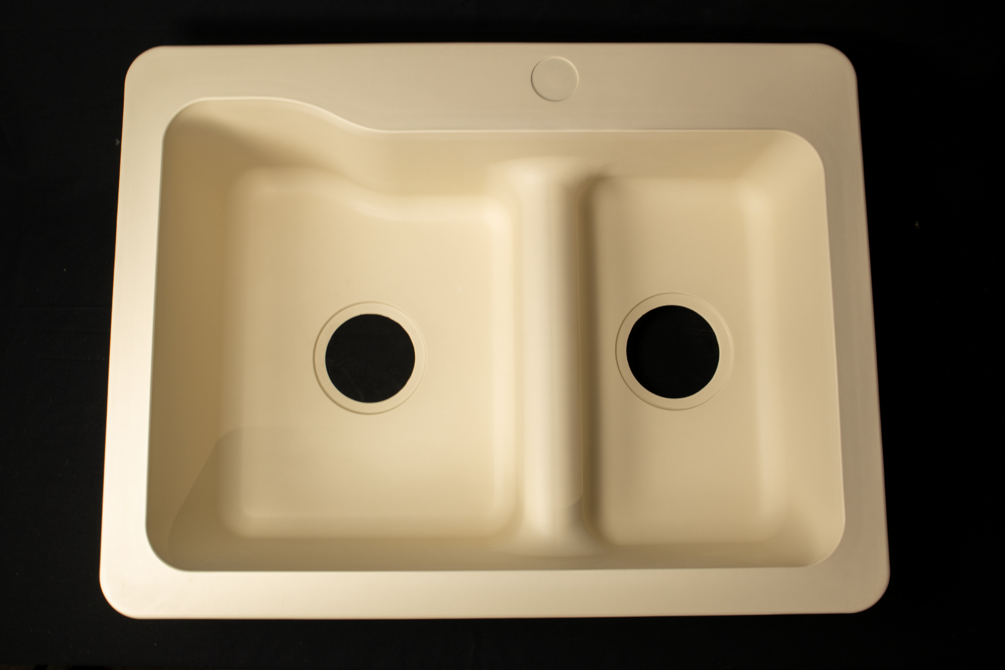 19″ x 25″ solid surface premium composite low-saddle double bowl kitchen sink.