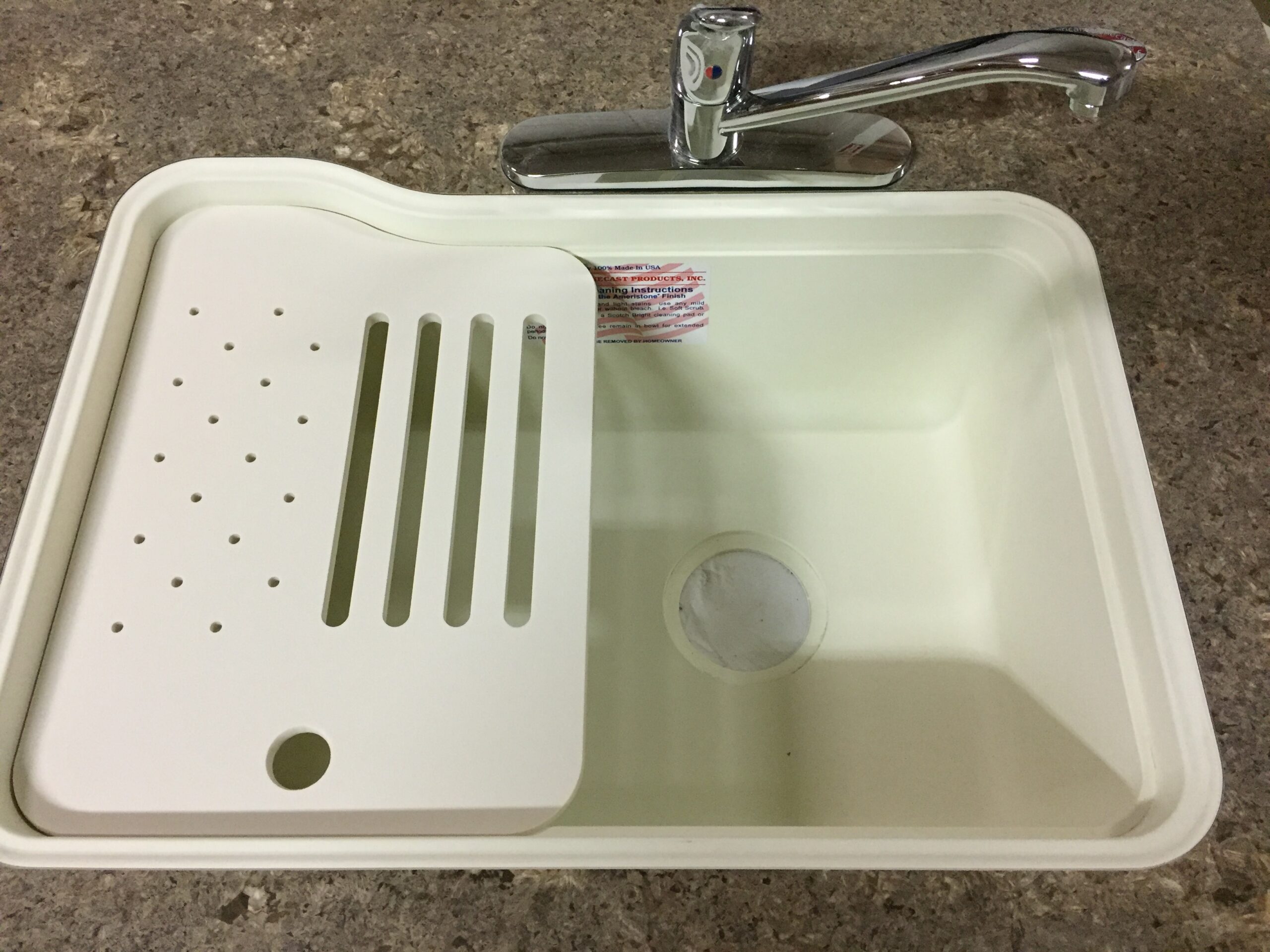 Another key benefit: the color is “through-body” — it extends all the way through the material, not just on the surface — so minor wear over time shows less than with coated sinks, and scratches or scuffs are less conspicuous. American Stonecast Products, Inc. With multiple mounting options (top-mount, under-mount, or flush-mount) and a variety of colors (Cream, Bone, Black Granite, White), these sinks can be installed in many kinds of countertops — ideal for tight spaces like RVs or small kitchens.